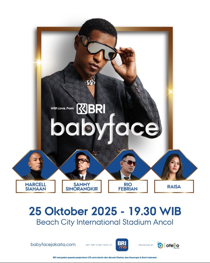 Bisnismetro.id, JAKARTA – Dalam 2 hari menjelang konser internasional yang sangat dinanti, “With Love From BRI Presents Babyface – Live in Jakarta 2025” siap memukau penonton di Beach City International Stadium (BCIS), Ancol, Jakarta. Konser yang dipersembahkan oleh PT Bank Rakyat Indonesia (Persero) Tbk (BRI), Otello Asia, dan Enjoy Live Experience ini akan menghadirkan pengalaman musik kelas dunia bersama Babyface, sang legenda peraih 13 Grammy Awards.