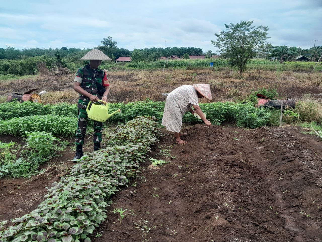 Semangat Babinsa Koramil 02/KT Kodim 0302/Inhu Pratu Bastanul Fauzi ikut terjun ke kebun membantu petani penyemaian bayam yg berada Di Desa Pulau Tongah Kec. Benai Kab. Kuansing. Selasa (03/02/2026).
