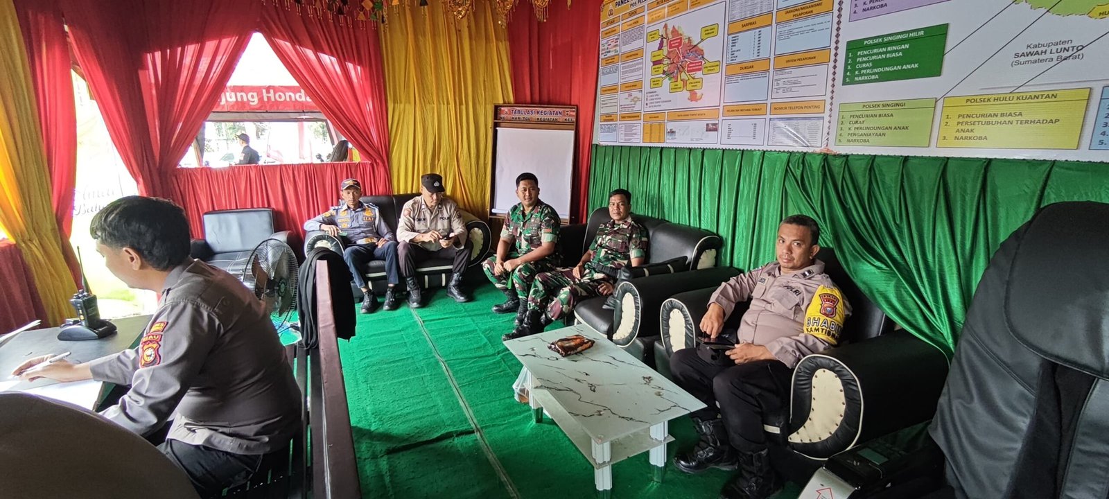 Dalam pelaksanakan siaga pengaman di Pos Pengamanan, Babinsa Koramil 02/Kuantan Tengah bergabung bersama Anggota Polri, Dinas Kesehatan, Dinas Perhubungan, Satpol PP, Senkom dan BPBD dan Instansi Lainnya Kabupaten Kuantan Singungi.
