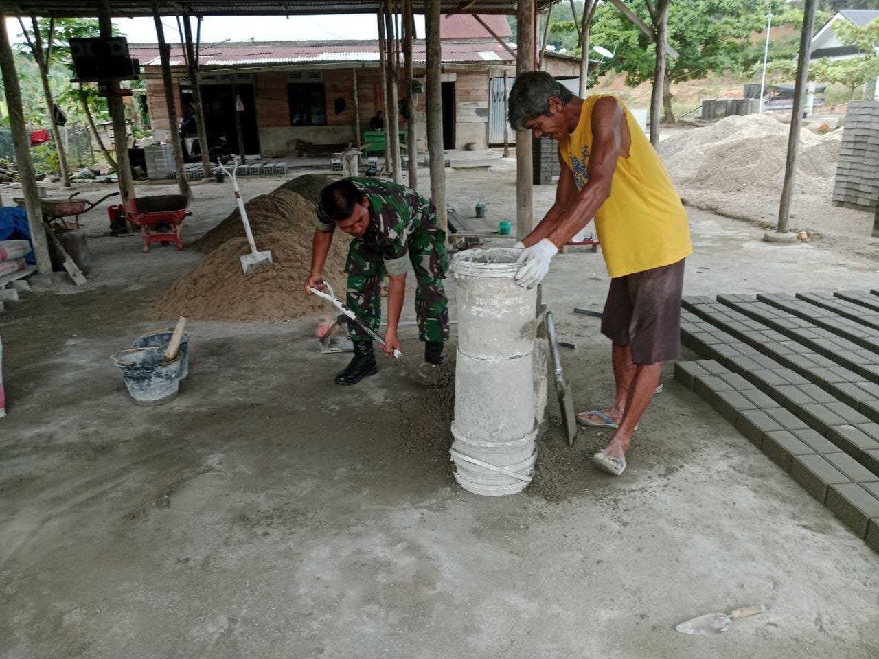 Teluk Kuantan – Dalam rangka meningkatkan kesejahteraan masyarakat dan membantu warga yang membutuhkan, Babinsa Koramil 02/KT Kodim 0302/Inhu Serka Doni Asmara melaksanakan kegiatan gotong royong membantu warga mencetak batu bata untuk pembuatan rumah, di Desa Siberkaun Kec. Benai Kab. Kuansing. Senin (10/11/2025).