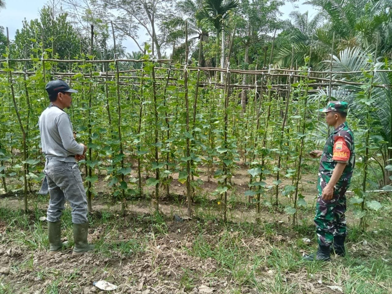 Bintara Pembina Desa (Babinsa) Koramil 08/KM Kodim 0302/Inhu Serda Ari Waluyo melaksanakan pendampingan dalam perawatan tanaman mentimun Di lahan milik Pak Rahman yang terletak di desa Pulau rumput Kecamatan gunung toar Kabupaten Kuantan Singingi. Jumat ( 27/02/2026 ).