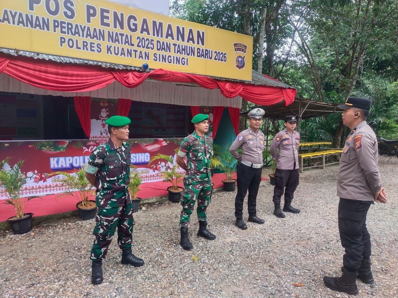 Babinsa Koramil 08/KM Kodim 0302/Inhu Serka Edi Syam dan Pratu Agil melaksanakan Kegiatan Pam Nataru bersama anggota Polsek Kuantan Mudik,Satpol pp,Dishub,BPBD dan Puskesmas,bertempat di Pos Pam Perbatasan Riau-Sumbar,Desa Kasang Kecamatan Kuantan Mudik Kabupaten kuantan Singingi guna memberikan rasa aman kepada warga pada libur Natal dan Tahun baru 2026. Senin ( 22/12/2025 ).
