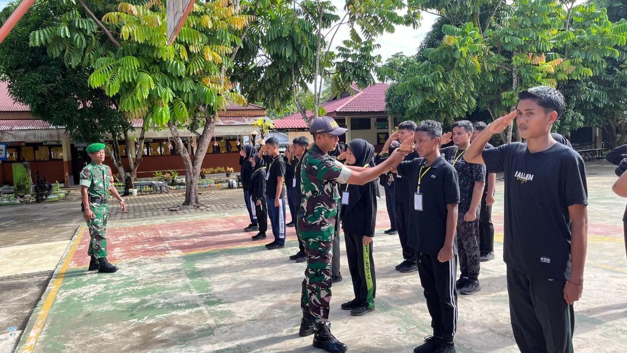 Bertempat di lapangan upacara SMAN 1 Kuantan Mudik,anggota Koramil 08/KM Kodim 0302/Inhu Serka Edi Syam dan Kopda Hendi memberikan Latihan Peraturan Baris Berbaris (PBB) dan Latihan Dasar Kepemimpinan Siswa (LDKS) kepada siswa/siswi calon anggota OSIS baru. Selasa (16/09/2025).