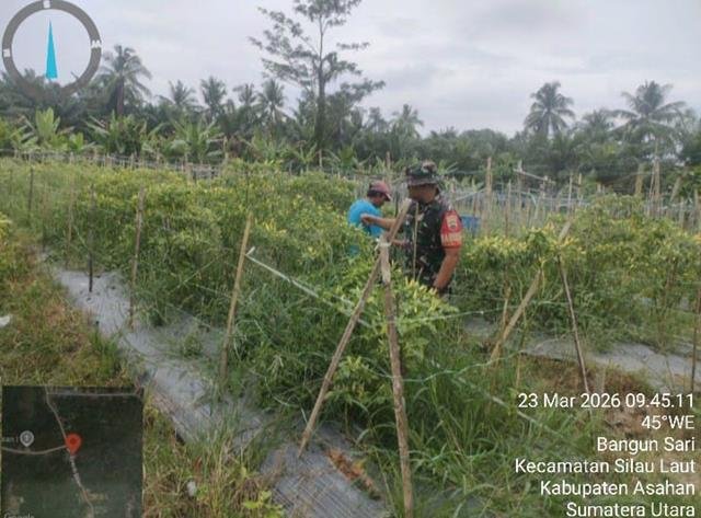 Dalam kesempatan ini seperti yang dilakukan oleh Personel Bintara Pembina Desa (Babinsa) Koramil 07/Air Joman jajaran Kodim 0208/Asahan Serda Armain S turun kewilayah binaan untuk melaksanakan kegiatan Komunikasi Sosial (Komsos) bersama dengan warga masyarakat binaan di areal pertanian warga yang sedang menanam cabai memberi semangat dan motivasi dengan masyarakat dengan laksanakan kegiatan pendampingan dalam perawatan tanaman cabe, pendampingan Perlawanan Kewilayahan yaitu Mengunjungi Kebun Cabai Milik Bapak Wagiran, bersama masyarakat melaksanakan pendampingan ketahanan pangan (Hanpang) jenis tanaman Cabai Hijau untuk membantu masyarakat memanen hasil kebun yang akan di jual ke pekan, bersama dengan Bapak Wagiran (Pemilik Kebun), kegiatan tersebut yang dilaksanakan bertempat di Dusun 2 Desa Bangun Sari Kecamatan Silau Laut Kabupaten Asahan, Senin (23/03/2026).