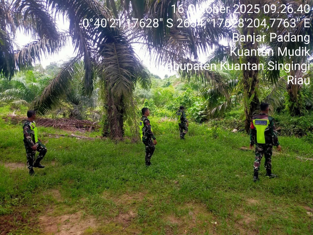 Babinsa Koramil 08/KM Kodim 0302/Inhu Sertu Nopin Yulwandi bersama 3 orang anggota Lainnya melaksanakan kegiatan patroli pencegahan kebakaran hutan dan lahan (karhutla) Di Desa Banjar padang kecamatan Kuantan mudik kabupaten Kuantan Singingi. Kamis ( 16/10/2025 ).