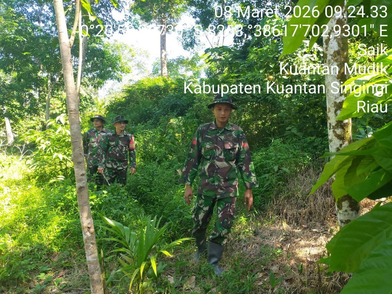 Babinsa Koramil 08/KM Kodim 0302/Inhu Sertu Nopin bersama rekan babinsa Lainnya melaksanakan kegiatan patroli pencegahan kebakaran hutan dan lahan (karhutla) Di Desa Saik kecamatan Kuantan mudik kabupaten Kuantan Singingi. Minggu ( 08/03/2026 ).
