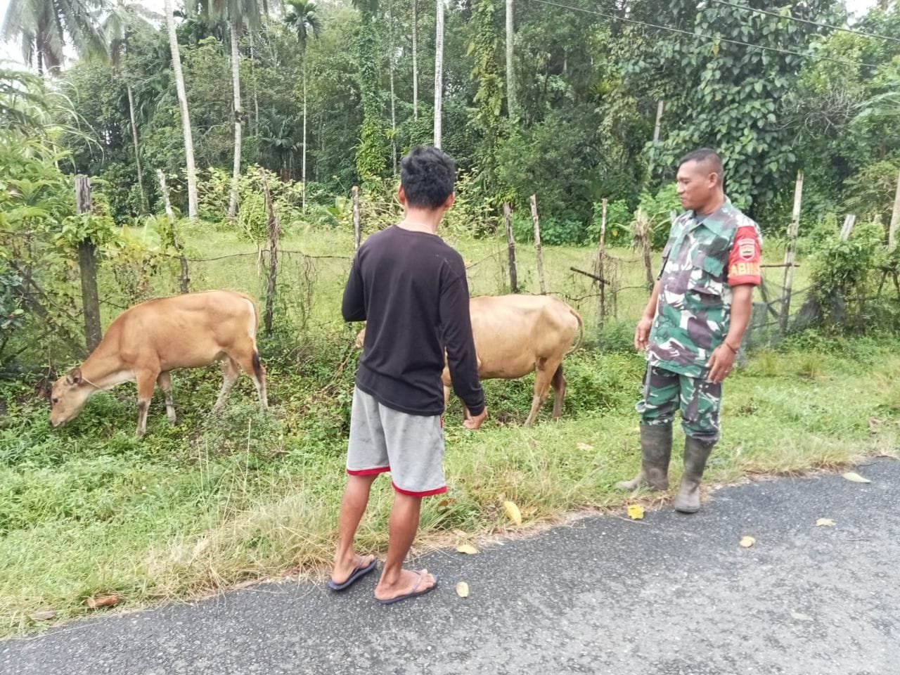 Anggota Koramil 08/KM Kodim 0302/Inhu Serda Ari Waluyo melaksanakan pemeriksaan terhadap ternak sapi milik warga di wilayah Desa binaan Demi mengantisipasi dan mencegah penularan Penyakit Mulut dan Kuku (PMK) bertempat Di Desa Petapahan Kecamatan gunung toar Kabupaten Kuantan Singingi. Selasa ( 06/01/2026 ).