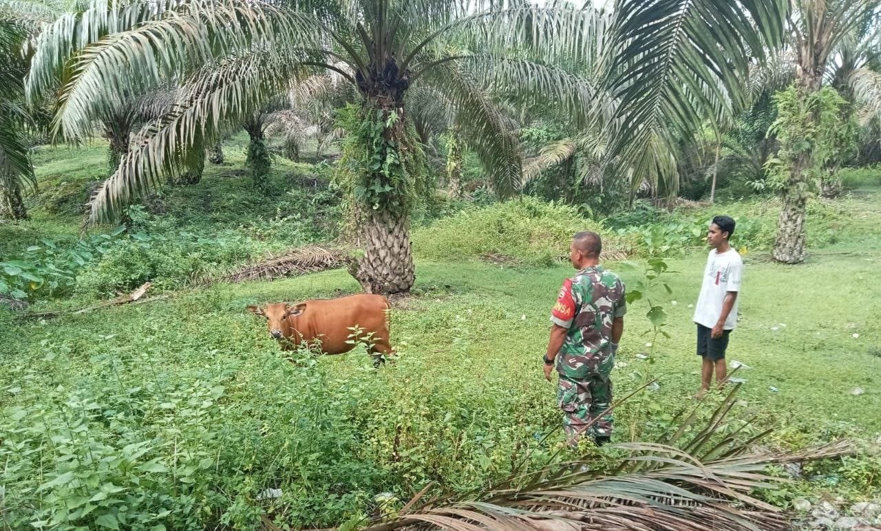 Anggota Koramil 08/KM Kodim 0302/Inhu Serda Ari Waluyo melaksanakan pemeriksaan terhadap ternak sapi milik warga di wilayah Desa binaan Demi mengantisipasi dan mencegah penularan Penyakit Mulut dan Kuku (PMK) bertempat Di Desa Banjar Guntung Kecamatan Kuantan Mudik Kabupaten Kuantan Singingi. Selasa (24/02/2026).