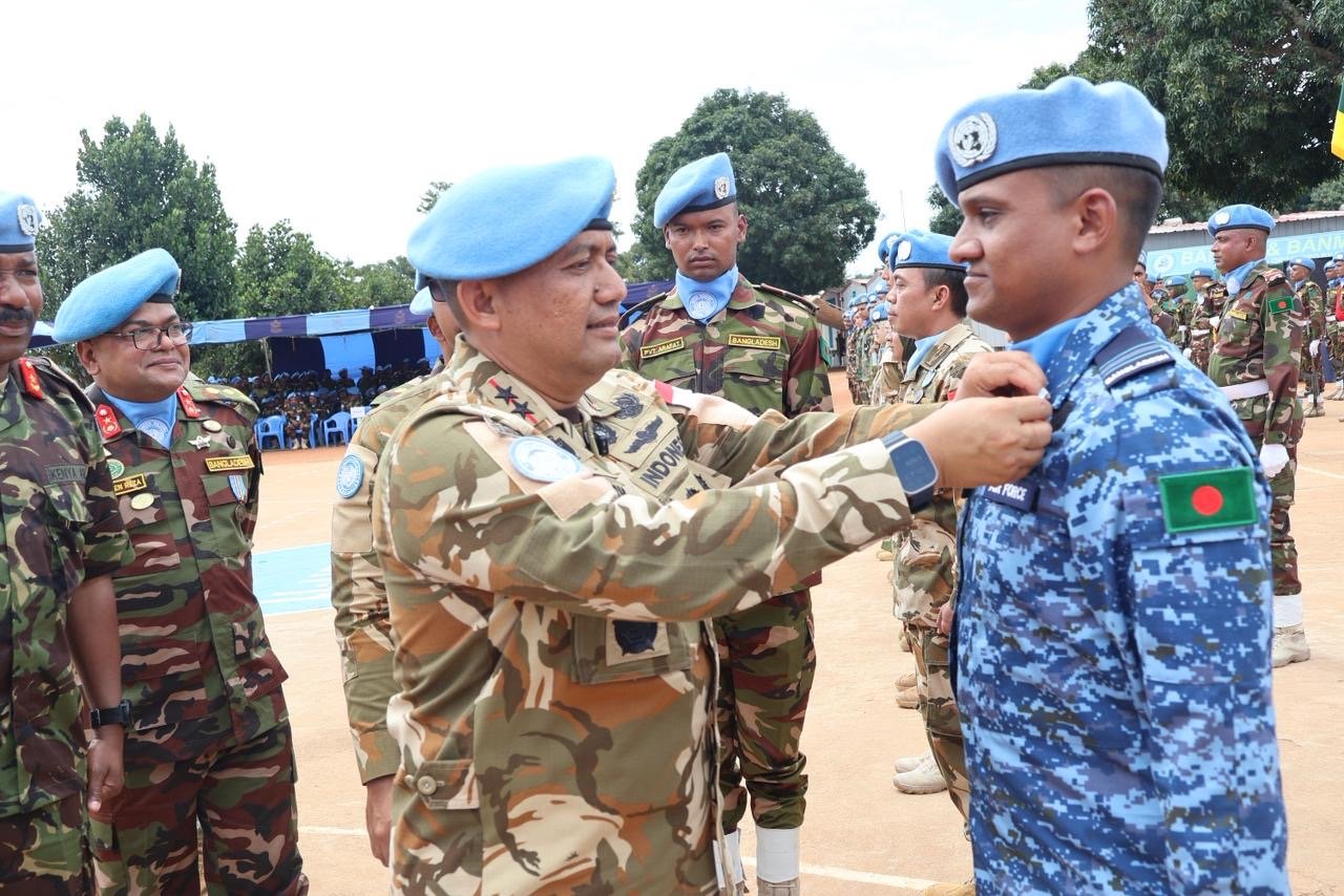 Afrika Tengah – Deputy Force Commander (DFC) MINUSCA, Mayor Jenderal TNI Maychel Asmi, P.S.C, S.E., M.Han., pimpin upacara Medal Parade gabungan bagi prajurit Bangladesh Battalion ke-11 (BANBAT-11) dan Bangladesh Level-2 Plus Hospital (BANMED-2/3) di Bouar, Republik Afrika Tengah, Jumat (7/11/2025).