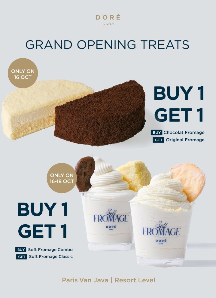 Dalam rangka merayakan grand opening, DORÉ by LeTAO menghadirkan promo spesial bagi para aDORÉbles — sebutan bagi para penggemar setia DORÉ by LeTAO. Nikmati penawaran Buy 1 Get 1 pada tanggal 16 Oktober 2025, di mana aDORÉbles bisa membeli Chocolat Fromage dan mendapatkan Original Fromage secara gratis.