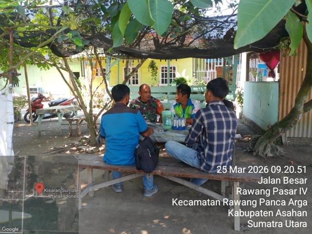Asahan | Komunikasi sosial yang dilakukan merupakan wadah silahturahmi antara Babinsa dengan tokoh Masyarakat sekitar, yang dapat memupuk kebersamaan dan menimbulkan rasa saling hormat menghormati antar sesama di wilayah Binaan, pentingnya Silahturahmi dengan tokoh-tokoh masyarakat di wilayah binaan merupakan suatu bentuk kedekatan kita dengan warga. Dalam kesempatan ini Personel Bintara Pembina Desa (Babinsa) Koramil 18/Meranti jajaran Kodim 0208/Asahan Serka Beslin turun kewilayah desa binaan untuk melaksanakan kegiatan Komunikasi Sosial (Komsos) bersama dengan Tokoh masyarakat dan warga masyarakat binaan, kegiatan komsos dengan Warga dan tokoh masyarakat dan membahas masalah cuaca yang tidak menentu dan sangat extrim yang akan mengakibatkan timbulnya berbagai macam penyakit dan Babinsa selalu mengingat kan pentingnya kekompakan kegiatan yg dilaksanakan didesa binaan selalu bekerja sama, bersama dengan Tomas Bapak Mukhsin, Bapak Agus, Bapak Mital dan Bapak Ismail, kegiatan tersebut yang dilaksanakan bertempat di Desa Rawang Pasar IV Kecamatan Rawang Panca Arga Kabupaten Asahan, Rabu (25/03/2026).