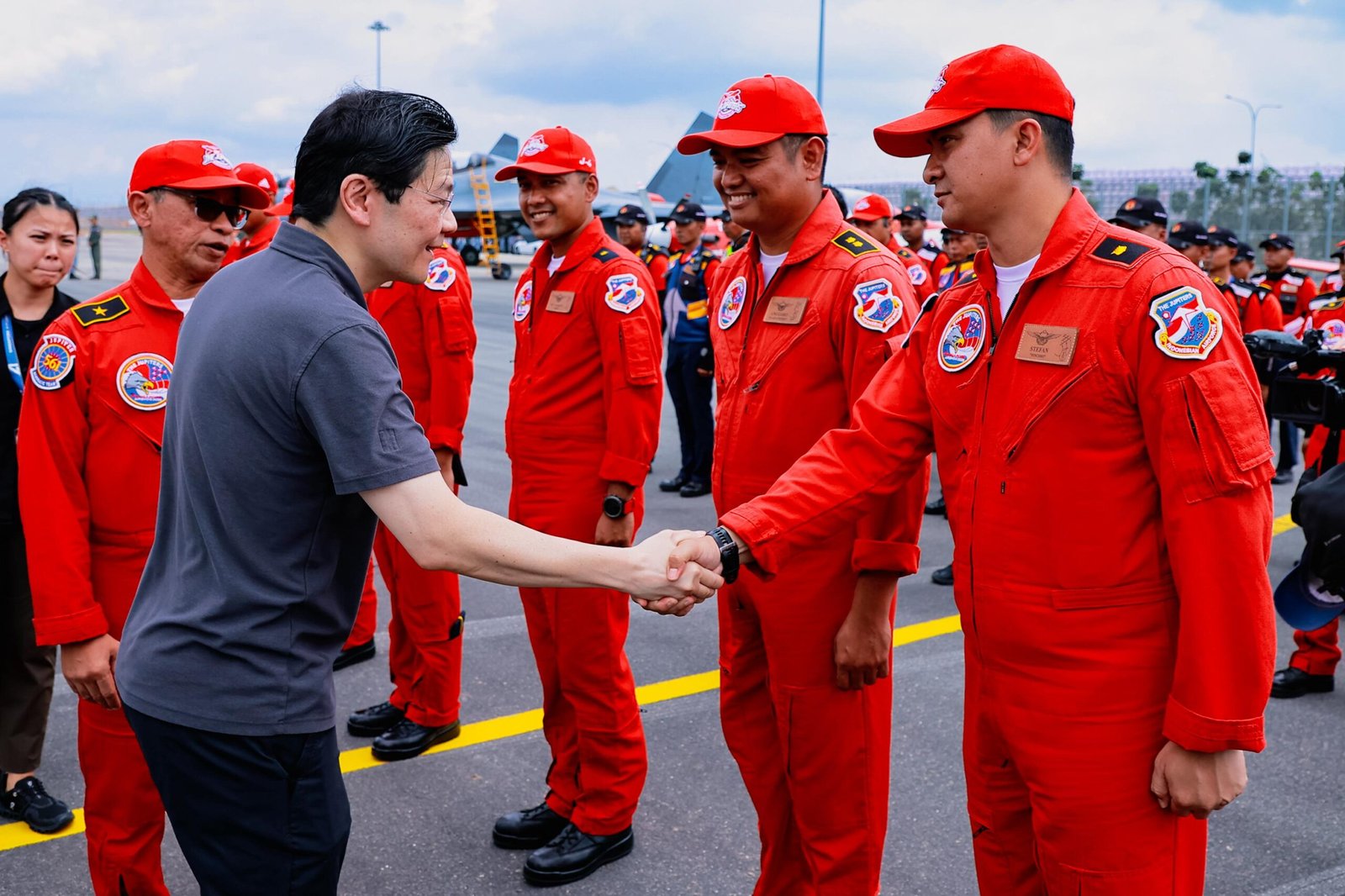Dalam kesempatan tersebut, Perdana Menteri Singapura meninjau secara langsung kesiapan para penerbang dan ground crew Jupiter Aerobatic Team menjelang pelaksanaan Public Day 1 Singapore Airshow 2026.