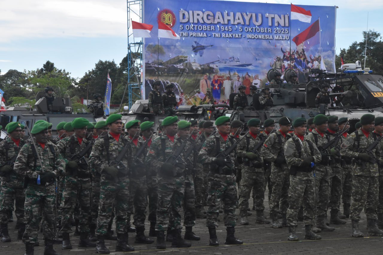 Timika, bisnismetro.id – Bertempat di Lapangan Apel Kantor Pusat Pemerintahan Kab. Mimika, Jl. Cenderawasih, Kel. Karang Senang, Sp.3, Distrik Kuala Kencana, Kodim 1710/Mimika bersama satuan TNI se-Garnisun Timika menggelar upacara peringatan Hari Ulang Tahun (HUT) ke-80 Tentara Nasional Indonesia (TNI) dengan Tema “TNI Prima, TNI Rakyat, Indonesia Maju” dan Inspektur Upacara Letkol Inf Indra Luthfi Wibisono, S.E, Danyonif 754/ENK, Minggu (05/10/2025).