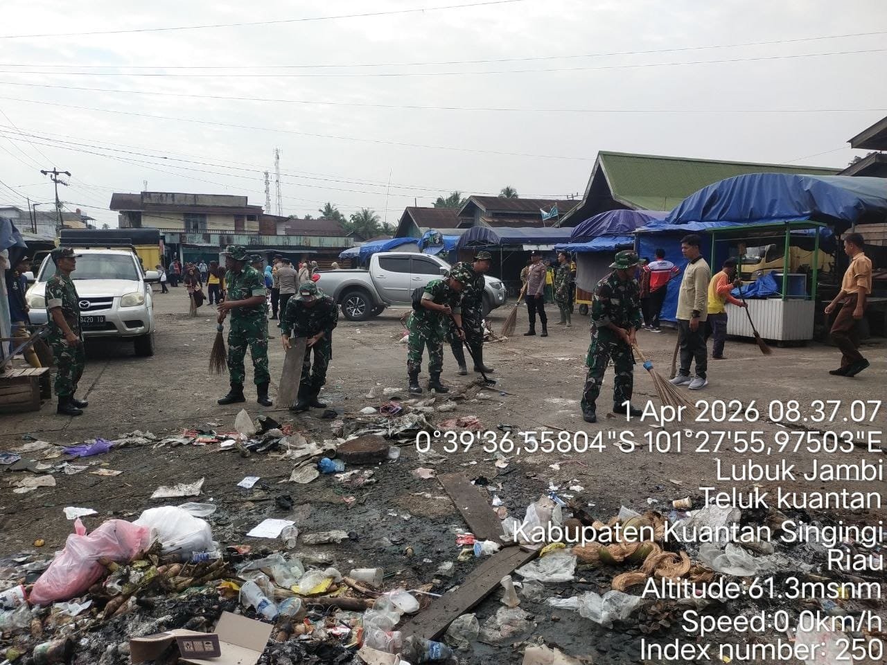 Guna menjaga lingkungan yang nyaman dan bersih,Personil Koramil 08/KM yang dipimpin langsung Danramil Kapten Inf Aplison bersama unsur pimpinan kecamatan (Upika) Kuantan Mudik melaksanakan kegiatan gotong royong (Goro) pembersihan Pasar Lubuk Jambi Kecamatan Kuantan Mudik Kabupaten Kuantan Singingi. Rabu (01/04/2026).