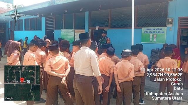 Asahan | Dalam rangka untuk membentuk sikap, kedisplinan, kekompakan, loyalitas dan kepedulian, rasa persatuan dan rasa tanggung jawab sejak dini adalah bagian dari bentuk keperdulian Babinsa Jajaran Kodim 0208/Asahan dengan memberikan pelatihan dasar Peraturan Baris Berbaris, dalam kesempatan ini seperti yang dilakukan oleh Personel Bintara Pembina Desa (Babinsa) Koramil 18/Meranti jajaran Kodim 0208/Asahan Pelda Jalil turun kewilayah binaan untuk melaksanakan kegiatan memberikan pelatihan kepada siswa dengan memberikan pelatihan PBB (peraturan baris berbaris) kpd anak” siswa/i Sekolah Madrasah Ibtidaiyah Al Hidayah, dengan melaksanakan kegiatan wanmil dengan memberikan pelatihan Peraturan Baris Berbaris kepada para siswa-siswi guna menanamkan kedisiplinan dan karakter para siswa, bersama dengan para Siswa-siswi Sekolah Madrasah Ibtidaiyah Al Hidayah, kegiatan tersebut yang dilaksanakan bertempat di Sekolah Madrasah Ibtidaiyah Al Hidayah Desa Suka Damai Kecamatan Pulo Bandring Kabupaten Asahan, Sabtu (11/04/2026).