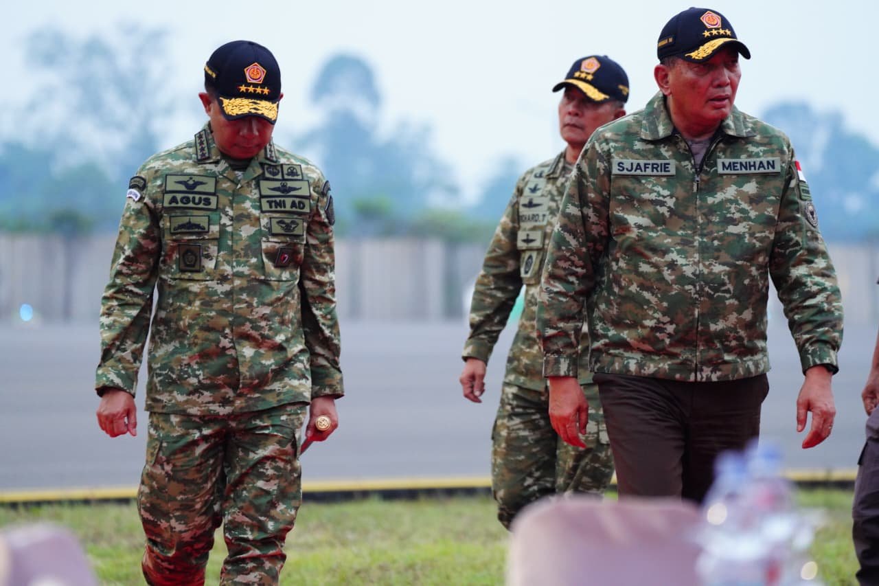 Morowali – Panglima TNI Jenderal TNI Agus Subiyanto mendampingi Menteri Pertahanan RI Sjafrie Sjamsoeddin, menyaksikan secara langsung latihan 3 (tiga) Jet tempur Sukhoi Su-27/30 yang berhasil mendaratkan paksa (force down) pesawat asing yang memasuki wilayah udara nasional tanpa izin. Kegiatan ini merupakan salah satu bagian dari Latihan Komando Gabungan (Kogab) TNI yang terintegrasi di kawasan Bandara PT IMIP, Morowali, Sulawesi Tengah, Rabu (19/11/2025).