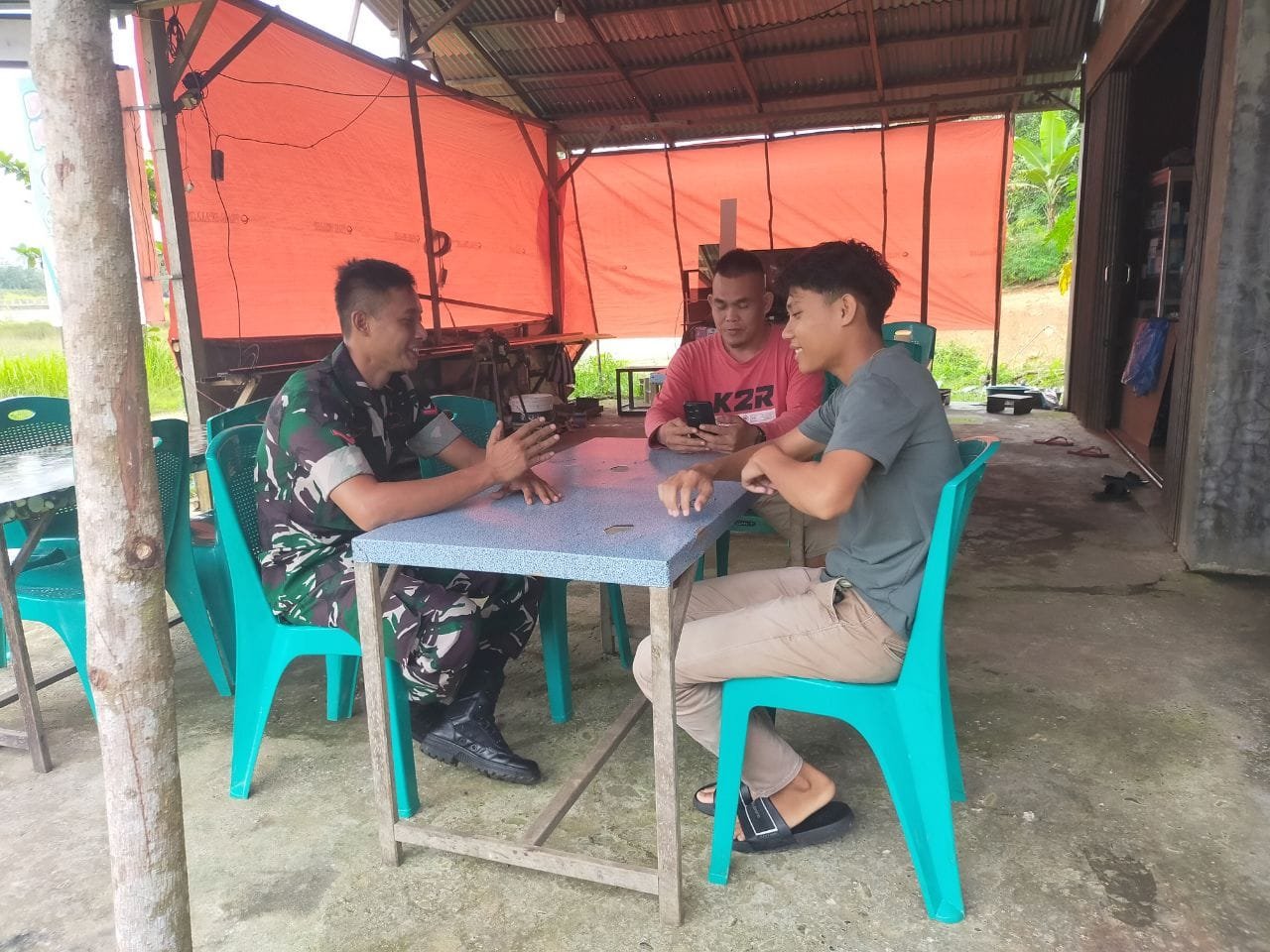 Babinsa Koramil 08/KM Kodim 0302/Inhu Kopda Amron melaksanakan kegiatan komunikasi sosial (Komsos) bersama warga binaan bertempat di Desa Toar Kecamatan gunung toar Kabupaten Kuantan Singingi. Minggu ( 02/11/2025 ).