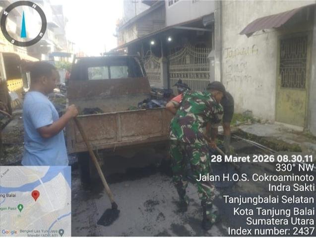 Tanjung Balai | Dalam rangka untuk menjaga kebersihan dan keindahan lingkungan serta guna mengantisipasi banjir pada musim hujan seperti sekarang ini, dalam kesempatan tersebut Personel Bintara Pembina Desa (Babinsa) Koramil 09/Tanjung Balai jajaran Kodim 0208/Asahan Kopda M Sutejo turun kewilayah binaan untuk melaksanakan kegiatan Gotong royong bersama dengan masyarakat melaksanakan Gotong Royong, membersihkan saluran parit, kegiatan Gotong-royong bersama masyarakat membersihkan badan jalan dan parit dan selokan agar terhindar dari genangan air yang dapat menimbulkan penyakit atau sarang nyamuk membuat desa menjadi nyaman dan indah di lihat, giat Gotong royong dengan warga sekitar, dengan tujuan membersihkan bahu jalan dan membersihkan selokan yg tumpat di karenakan, lumpur yg sangat tebal dan batu yg terhambat, dan selalu mengajak dan memotivasi warga agar selalu turut serta menjaga kamtibnas, dan menjaga lingkungan tetap terjaga kebersihannya, bersama dengan Bapak Idrus Tomas, Bapak Agus Kepling, Bapak Arif warga, Bapak Zainal warga dan Bapak Ucok warga, kegiatan tersebut yang dilaksanakan bertempat di Jalan H.O.S Cokrominoto Kelurahan Indra Sakti Kecamatan Tanjung Balai Selatan Kota Tanjung Balai, Sabtu (28/03/2026).
