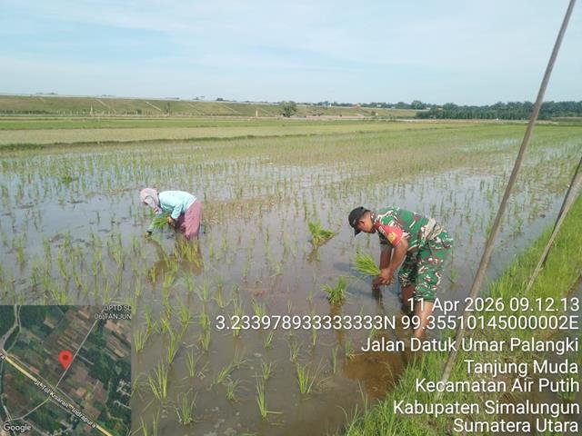 Dalam kesempatan ini seperti yang dilakukan oleh Personel Bintara Pembina Desa (Babinsa) Koramil 02/Air Putih jajaran Kodim 0208/Asahan Sertu Supardi turun kewilayah desa binaan untuk turut serta melaksanakan kegiatan Wanwil dengan warga binaan dalam rangka kegiatan ini bertujuan untuk membantu petani menyisip tanaman padi yang mati agar pertumbuhan padi jadi subur dan hasil panen bisa memuas kan supaya petani lebih sejahterah, kegiatan Hanpangan membantu petani menyisip tanaman padi yang mati di makan hama keong supaya pertumbuhannya bisa merata, kegiatan pendampingan ketahanan pangan dengan ikut serta membantu menyisip tanaman padi dengan membantu Petani menyisip padi, bersama dengan Bapak Karnis (pemilik sawah), kegiatan tersebut yang dilaksanakan bertempat di Desa Tanjung Muda Kecamatan Air Putih Kabupaten Batu Bara, Sabtu (11/04/2026).