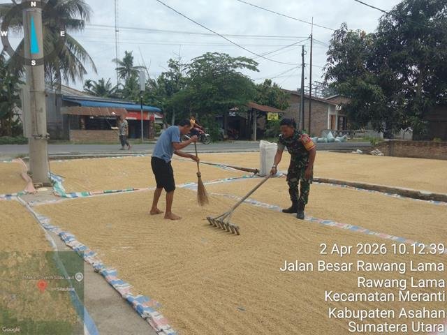 Asahan | Selain membantu secara langsung, para Babinsa juga memberikan edukasi kepada para petani untuk meningkatkan produktivitas dan kualitas hasil panen mereka, kami berharap pendampingan seperti ini dapat memberikan dampak positif kepada petani dalam menjaga kualitas panen mereka, dalam kesempatan ini seperti yang dilakukan oleh Personel Bintara Pembina Desa (Babinsa) Koramil 18/Meranti jajaran Kodim 0208/Asahan Koptu Julianto turun kewilayah binaan untuk menunjukkan dedikasinya dalam mendukung masyarakat desa binaannya dan melaksanakan kegiatan ketahanan pangan membantu menjemur gabah padi yang masih basah, dengan melaksanakan kegiatan wanwil membantu menjemur padi bersama warga, bersama dengan Bapak Andi (warga) dan Bapak Sofyan (warga), kegiatan tersebut yang dilaksanakan bertempat di Dusun XI Desa Rawang Lama Kecamatan Rawang Panca Arga Kabupaten Asahan, Kamis (02/04/2026).