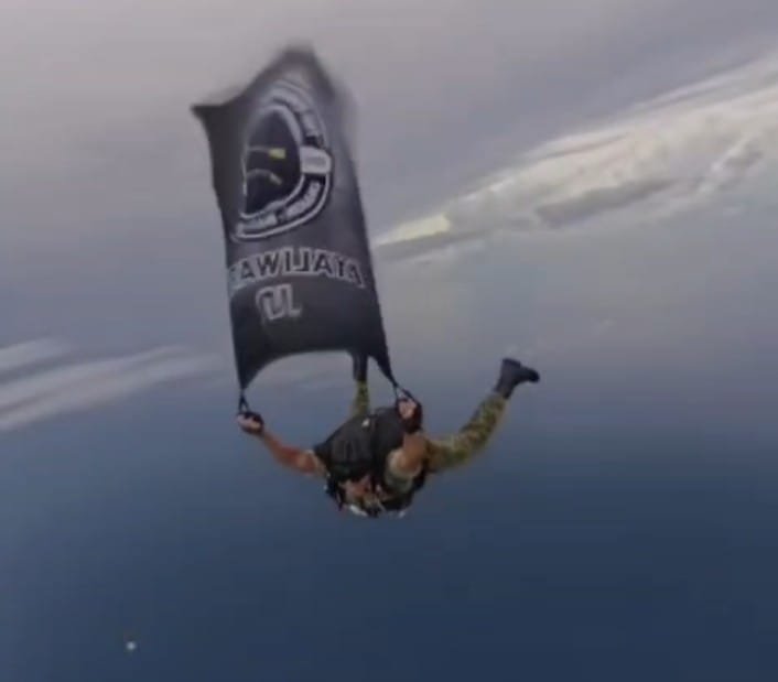 Penerjunan diawali oleh Komandan Batalyon Parako 481 Pasgat, Letkol Pas Mansyur Mannyaurang, yang mengibarkan bendera satuan saat melayang di udara. Aksi tersebut menjadi simbol semangat juang serta kebanggaan prajurit Korpasgat dalam setiap latihan terjun payung.