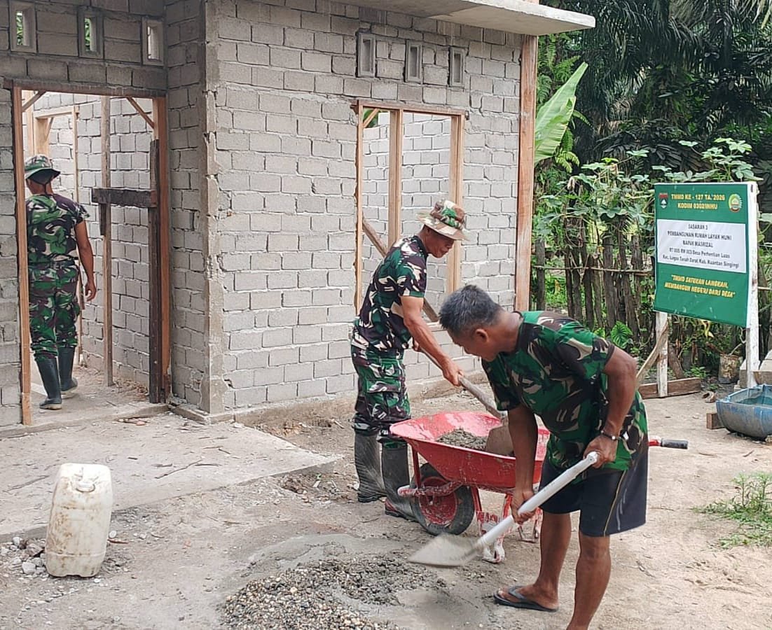 Teluk Kuantan – Program TNI Manunggal Membangun Desa (TMMD) ke-127 Tahun Anggaran 2026 terus diburu mengingat waktu yang tidak terlalu lama lagi , penghunian diharapkan bisa langsung digunakan waktu dekat. Hari libur dan bulan suci ramadhan satgas masih berjimbaku dengan percepatan pembangunan seperti hari ini. Senin (02/03/2026).