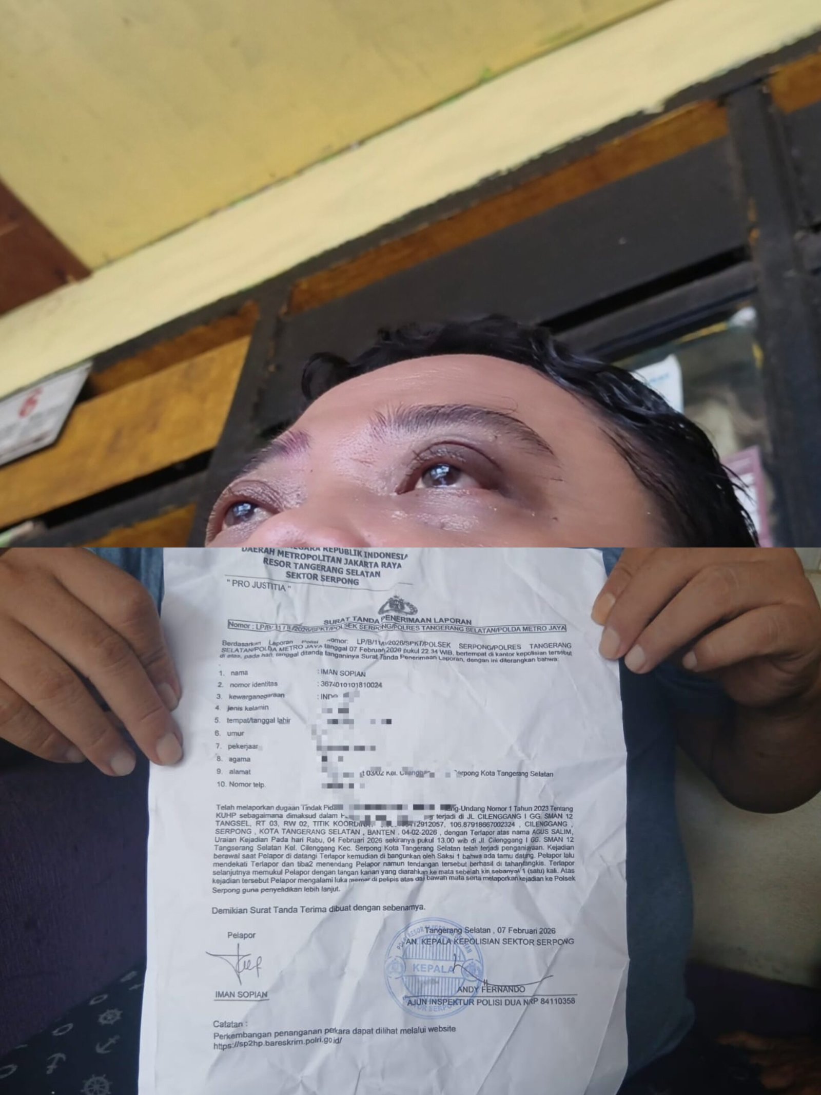Merasa keadilan terinjak-injak, Iman telah melaporkan dugaan penganiayaan ini ke Polsek Serpong dengan nomor LP/B/11/II/2026/SPKT/Polsek Serpong/Polres Tangerang Selatan/Polda Metro Jaya.