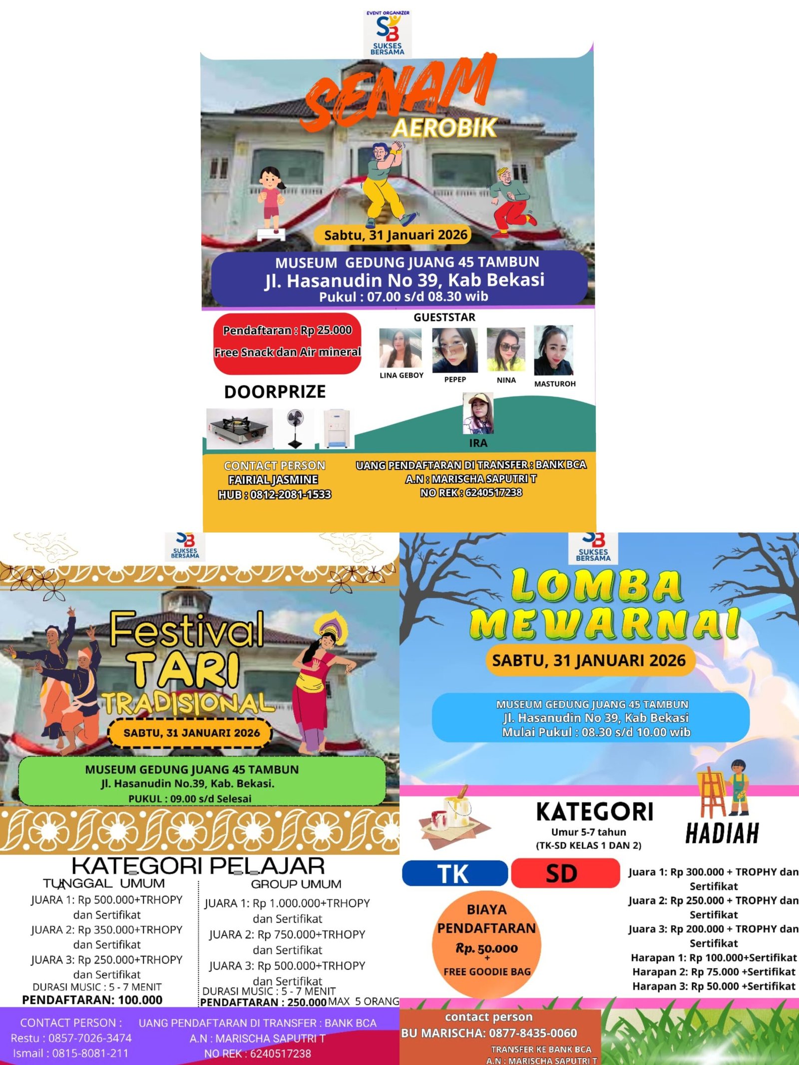 Bisnismetro.id, BEKASI – Event Organizer Sukses Bersama (SB) akan menggelar rangkaian kegiatan olahraga, seni, dan budaya pada Sabtu, 31 Januari 2026 di Museum Gedung Juang 45 Tambun, Kabupaten Bekasi. Acara ini akan dimulai dengan Senam Aerobik pada pukul 07.00–08.30 WIB, diikuti Lomba Mewarnai untuk anak usia 5–7 tahun pada pukul 08.30–10.00 WIB, dan Festival Tari Tradisional yang akan berlangsung mulai pukul 09.00 WIB hingga selesai.