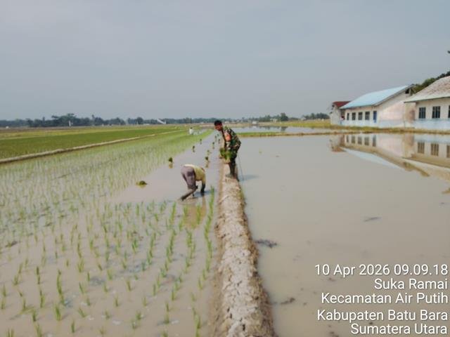 Dalam kesempatan ini seperti yang dilakukan oleh Personel Bintara Pembina Desa (Babinsa) Koramil 02/Air Putih jajaran Kodim 0208/Asahan Serda Indra turun kewilayah binaan untuk turut serta melaksanakan kegiatan pendampingan Hanpangan, dengan melaksanakan Pendampingan kepada petani menanam padi agar tercipta suwasembada pangan, kegiatan Ketahanan Pangan membantu pembagi bibit padi kepada padi pekerja tanam padi lahan sawah milik Bapak B Aritonang seluas 8 rante, kegiatan tersebut bertujuan untuk menciptakan hubungan yang humanis antara babinsa dengan warga binaan, Babinsa senantiasa menghimbau dan memberikan Motivasi agar petani lebih semangat dan kreatif dalam bertani agar mendapat hasil yang memuaskan, bersama dengan Ibu B Aritonang (Pekerja Lahan) dan Ibu Sirait (Pekerja Lahan), kegiatan tersebut yang dilaksanakan bertempat di Desa Sukaramai Kecamatan Air Putih Kabupaten Batu Bara, Jumat (10/04/2026).