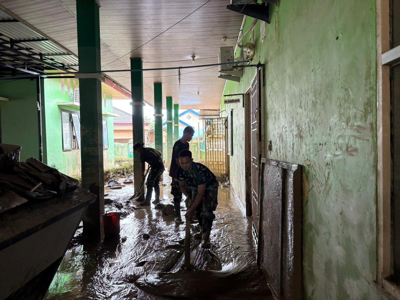 Sebanyak 23 personel Brigif 25/Siwah diterjunkan guna membantu memulihkan kondisi puskesmas yang terdampak banjir agar dapat kembali berfungsi secara optimal. Kegiatan pembersihan meliputi ruang pelayanan, ruang perawatan, halaman puskesmas, serta saluran air yang dipenuhi lumpur dan material sisa banjir.