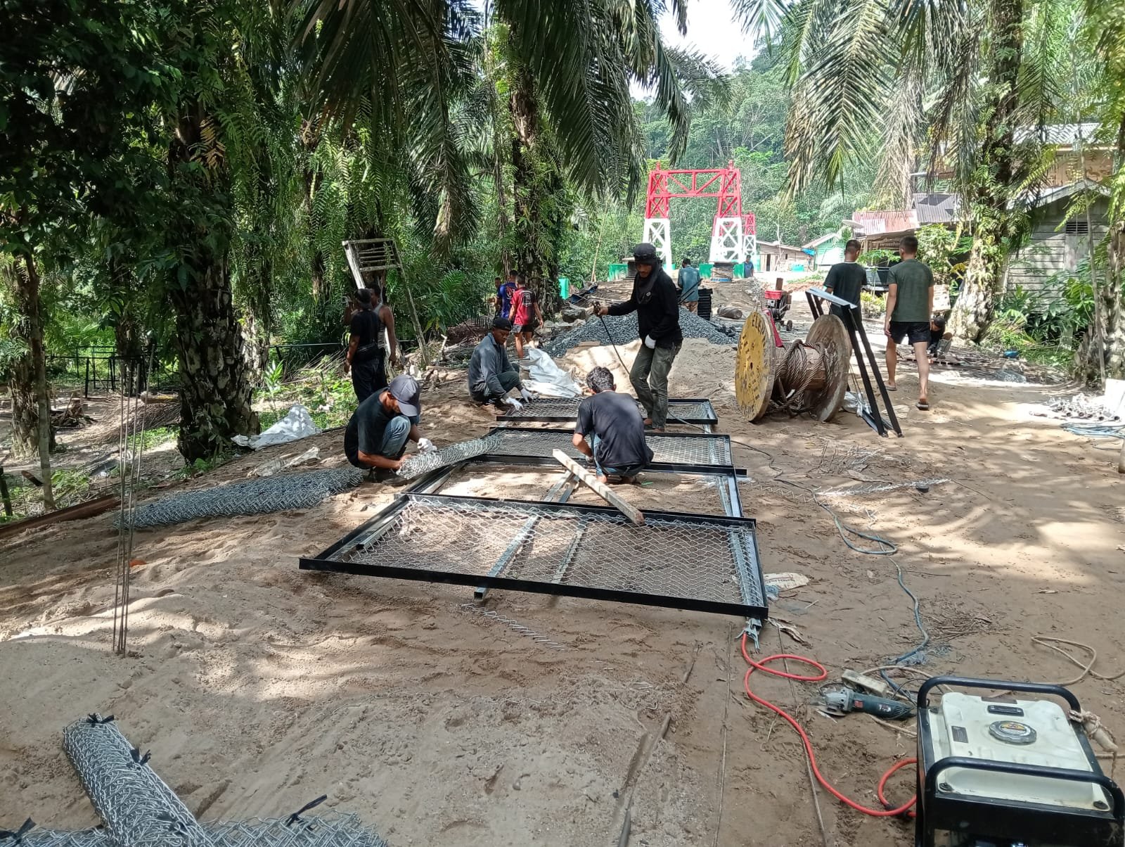 Tahap pengerjaan terkini, pekerja dari Babinsa dan Kodim 0302/Inhu masih melakukan Pemasangan lantai gelagar melintang, paprikasi angkur, pemasangan kawat harmonika/pagar pada struktur jembatan gantung.