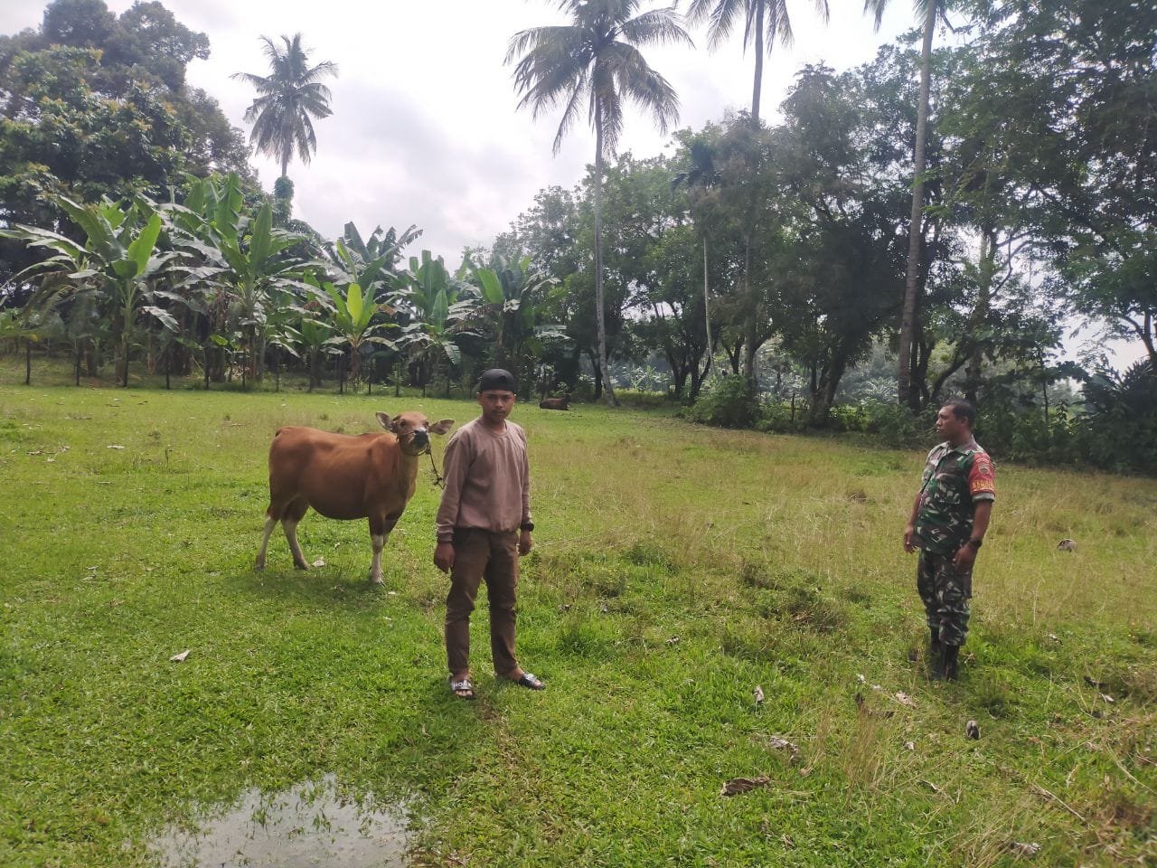Babinsa Koramil 08/KM Kodim 0302/Inhu Serda Ari Waluyo melaksanakan sosialisasi dan pengecekan hewan ternak milik warga dalam rangka mewaspadai wabah penyakit mulut dan kuku (PMK) pada ternak sapi di wilayah binaannya Di Desa teluk beringin Kecamatan gunung toar Kabupaten Kuantan Singingi. kamis ( 25/09/2025 ).